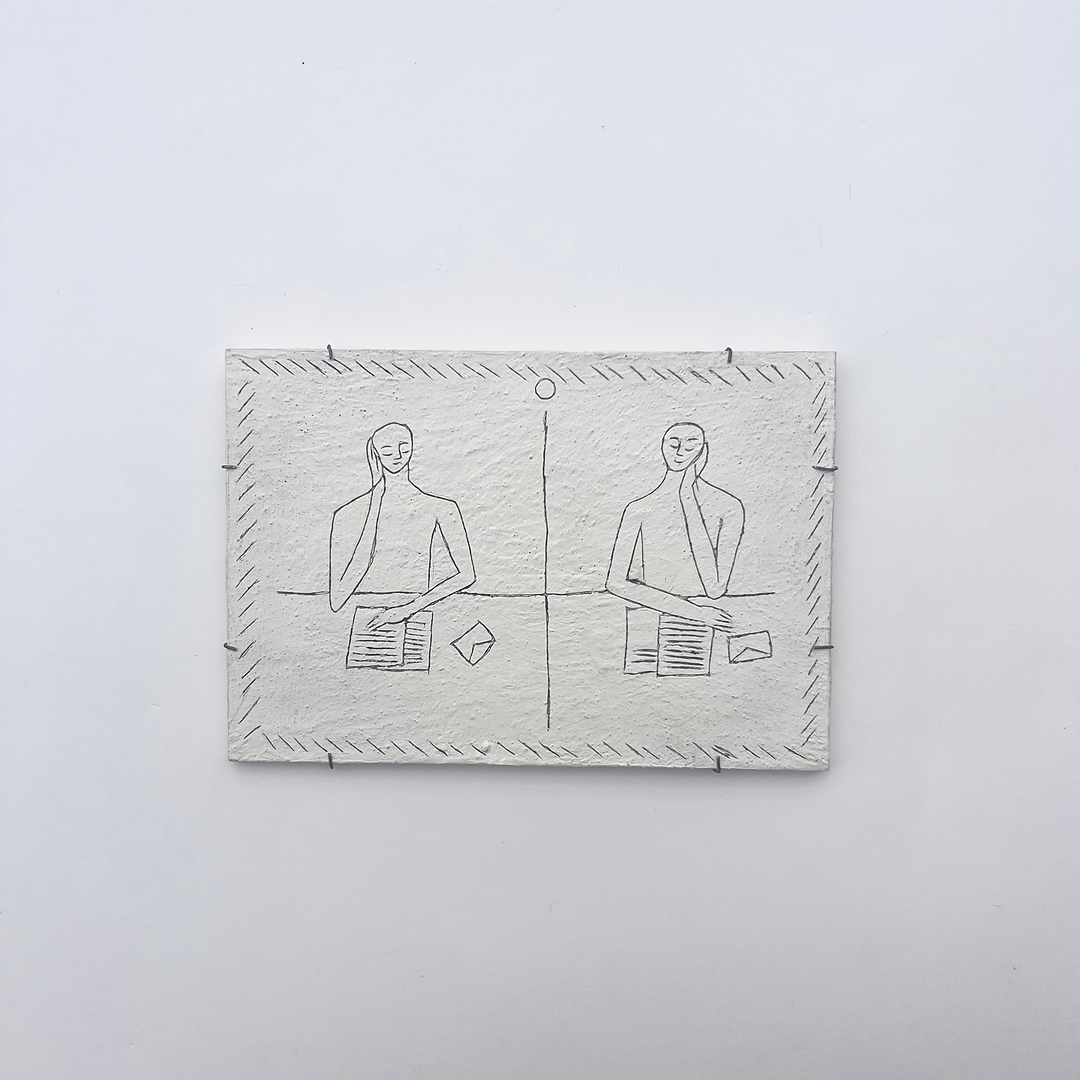 隔たりと繋がりを題材に、2023年に制作した連作「対話」。版画制作の経験から得た発想に基づき、作品はオリジナルでありながらもエディションとして捉え、すべての作品にエディションナンバーを刻印しています。実際の手紙ほどの大きさでそのまま壁にかけることができます。