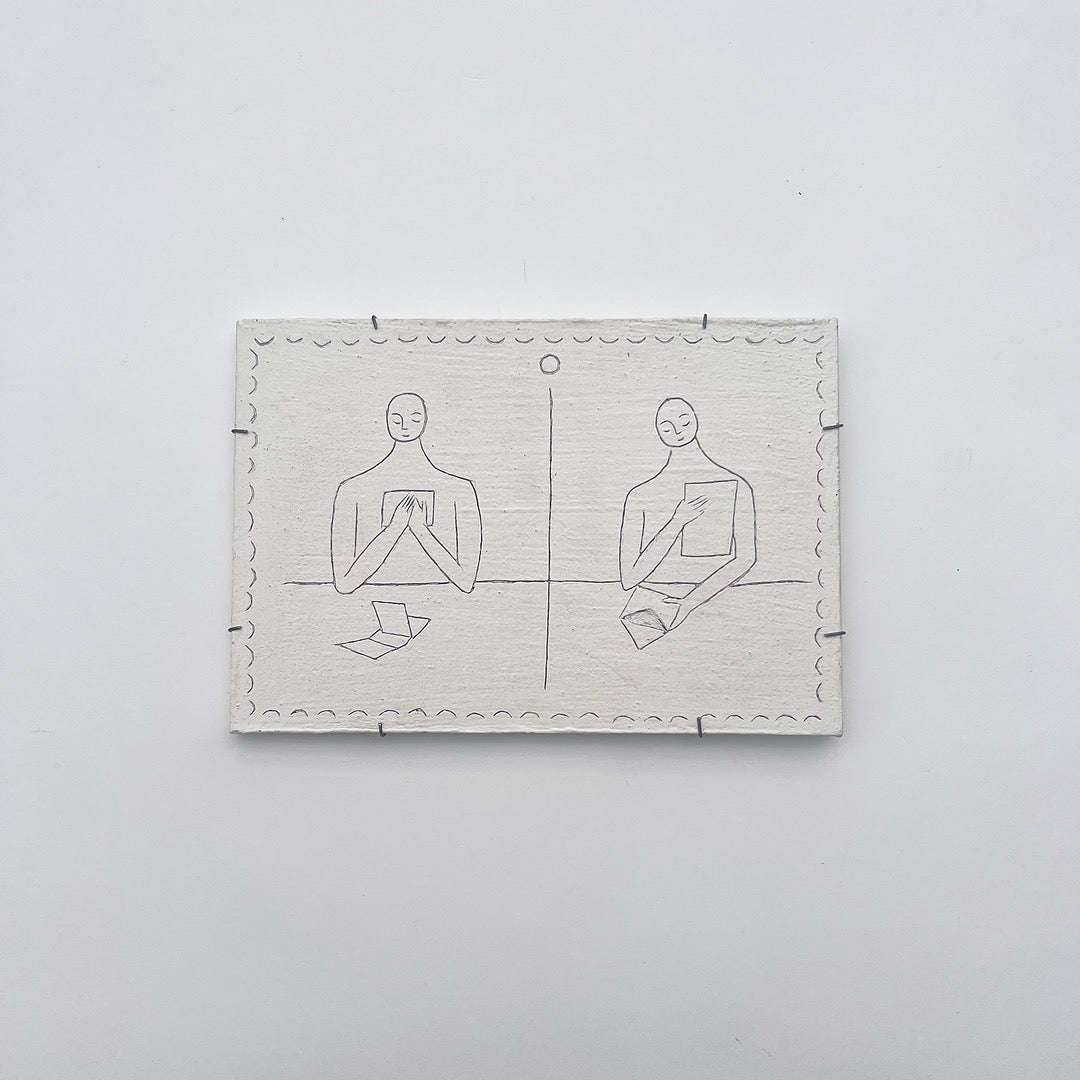 隔たりと繋がりを題材に、2023年に制作した連作「対話」。版画制作の経験から得た発想に基づき、作品はオリジナルでありながらもエディションとして捉え、すべての作品にエディションナンバーを刻印しています。実際の手紙ほどの大きさでそのまま壁にかけることができます。
