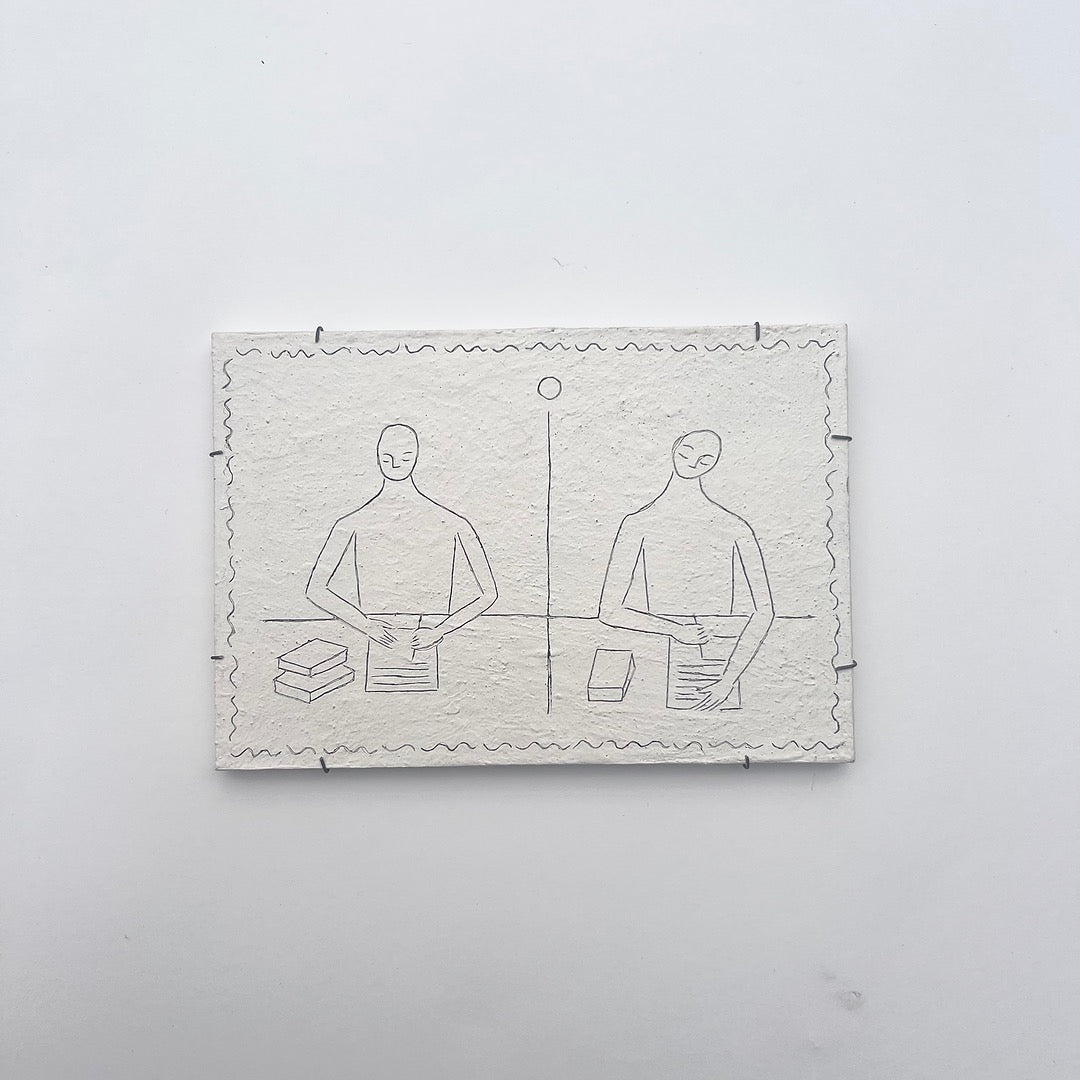 隔たりと繋がりを題材に、2023年に制作した連作「対話」。版画制作の経験から得た発想に基づき、作品はオリジナルでありながらもエディションとして捉え、すべての作品にエディションナンバーを刻印しています。実際の手紙ほどの大きさでそのまま壁にかけることができます。