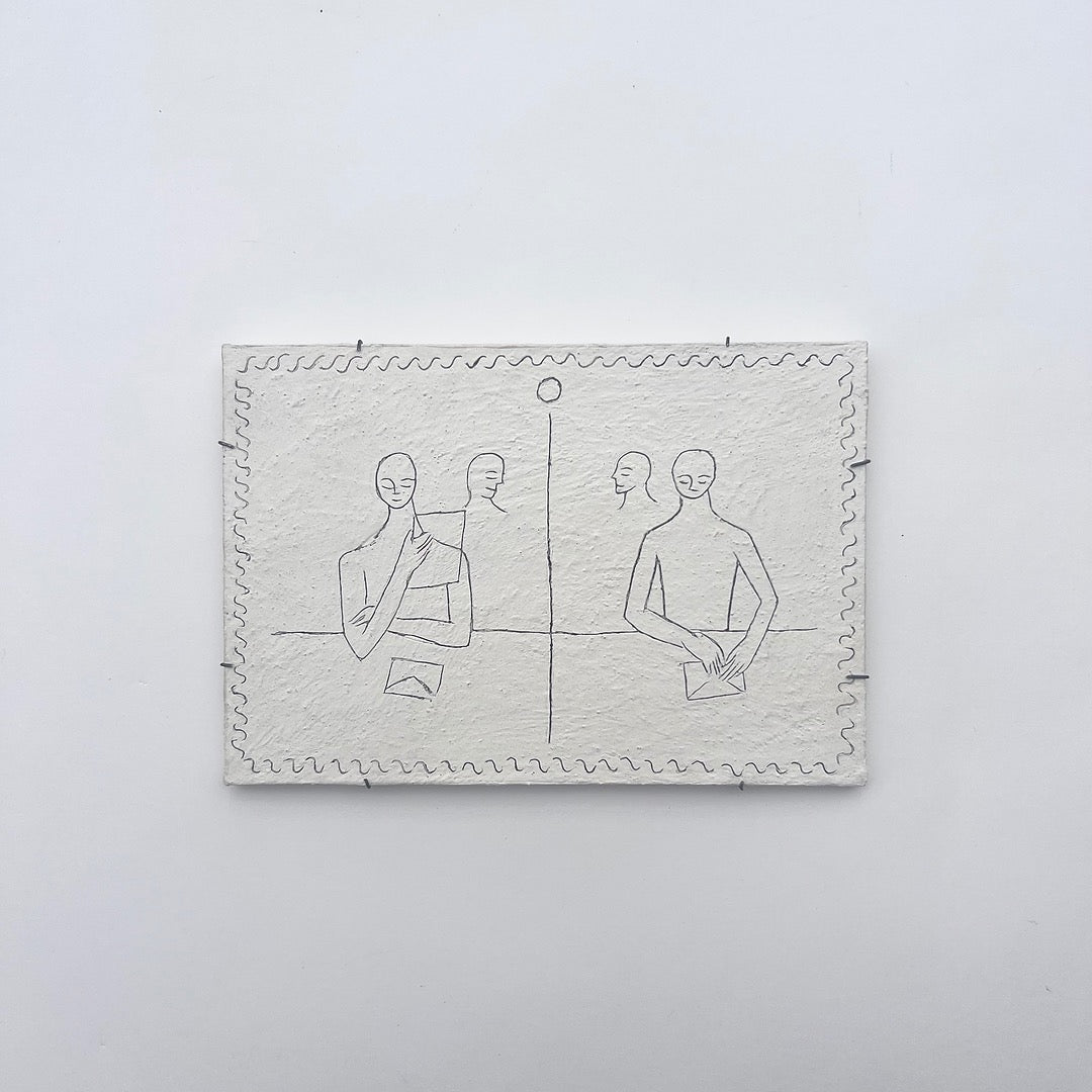 隔たりと繋がりを題材に、2023年に制作した連作「対話」。版画制作の経験から得た発想に基づき、作品はオリジナルでありながらもエディションとして捉え、すべての作品にエディションナンバーを刻印しています。実際の手紙ほどの大きさでそのまま壁にかけることができます。