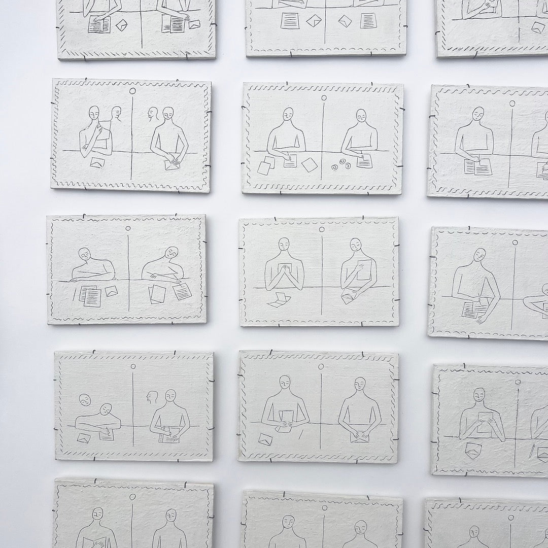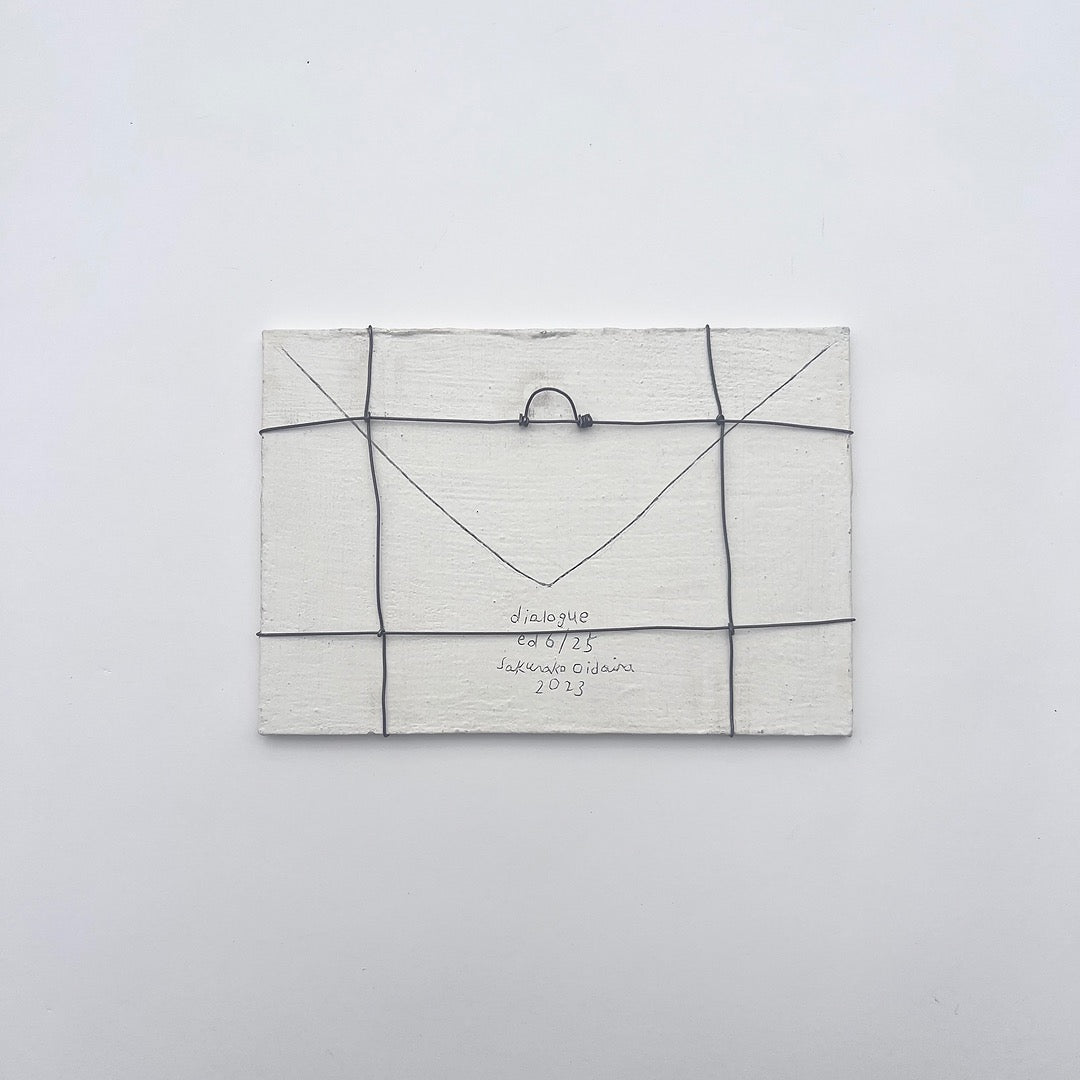隔たりと繋がりを題材に、2023年に制作した連作「対話」。版画制作の経験から得た発想に基づき、作品はオリジナルでありながらもエディションとして捉え、すべての作品にエディションナンバーを刻印しています。実際の手紙ほどの大きさでそのまま壁にかけることができます。